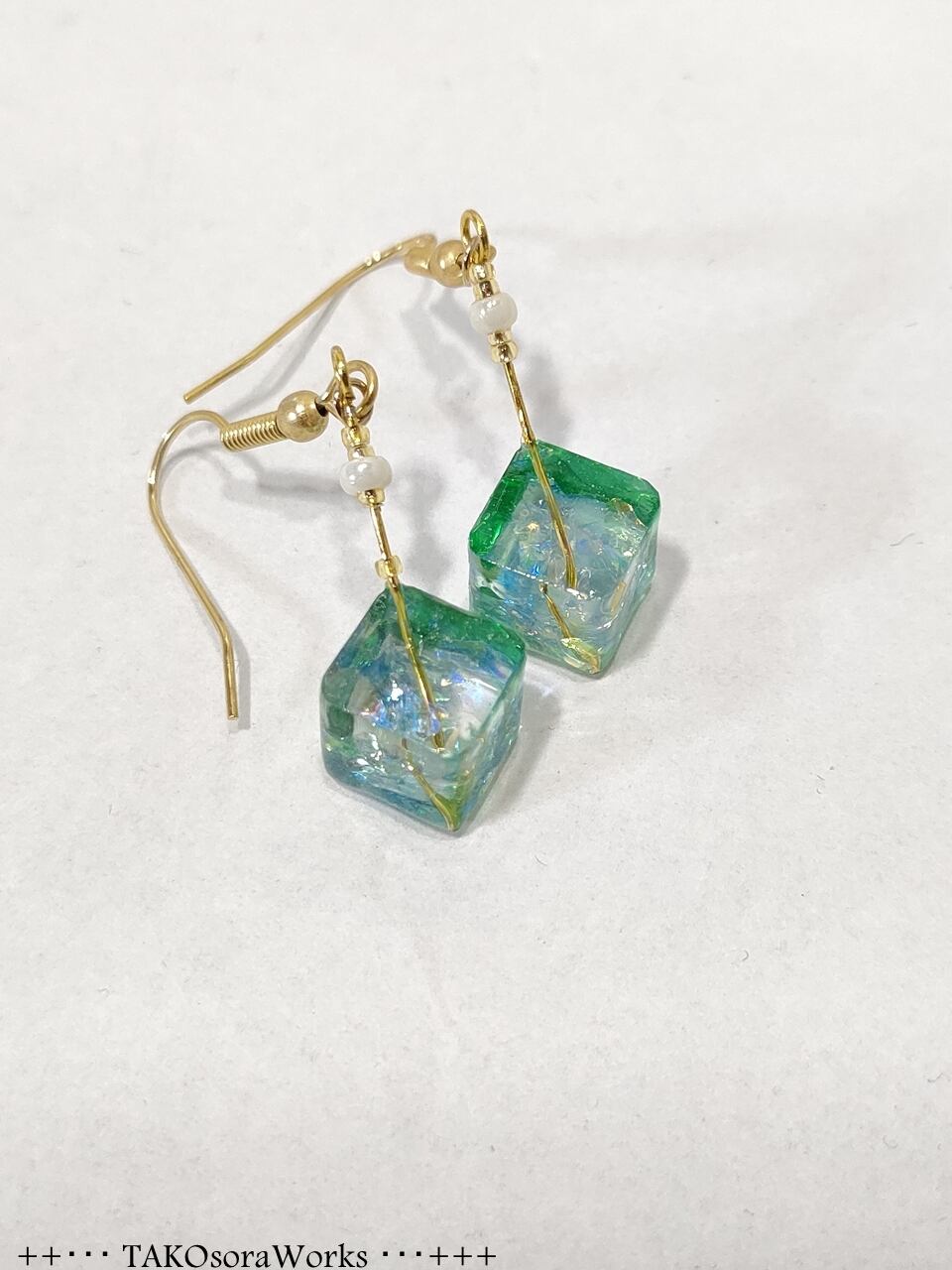 【商品の特徴】海のようなキューブをピアスにしました(イヤリングへの変更可能)。中にホログラムを入れるコトで波のキラキラを表現しました。是非光にかざしてみてください。このピアスは耳の下でゆらゆら揺れて動くたびに違う表情を見せます。